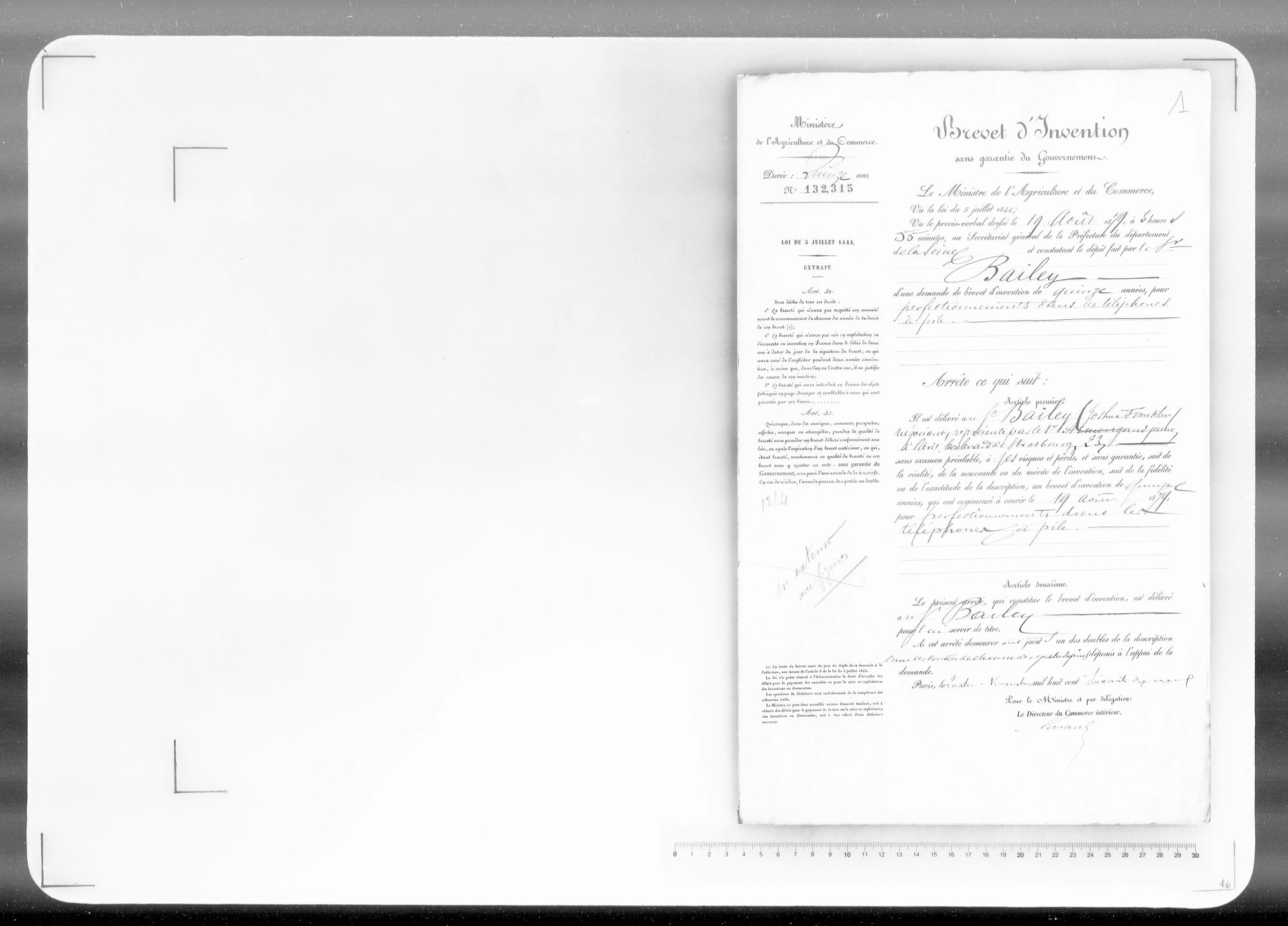 perfectionnements apportés dans les téléphones à pile Cote du dossier 1BB132315_1 Numéro du brevet 132315 Type de brevet Certificat d'addition Date de dépot 04.10.1879 Applicant(s) / Profession(s) BAILEY Joshua Voir les dossiers liés : brevet initial et addition(s) Acheter la reproduction Lien pérenne https://archives.inpi.fr:443/ark:55749/1ef040cce36e61729b9d0050568c1d46.moteur=arko_default_63f395e1547dd