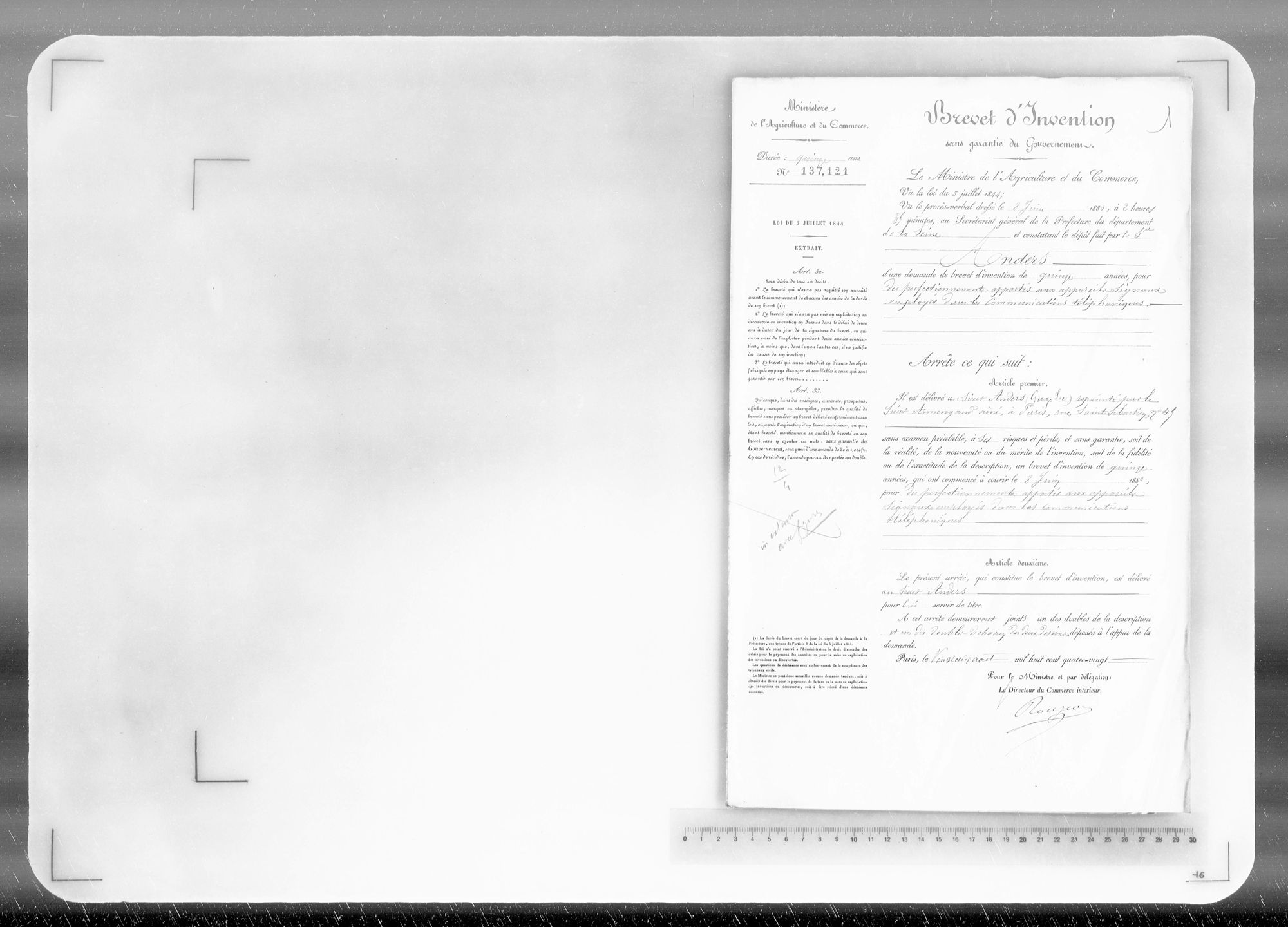 - Brevet d'invention de 15 ans