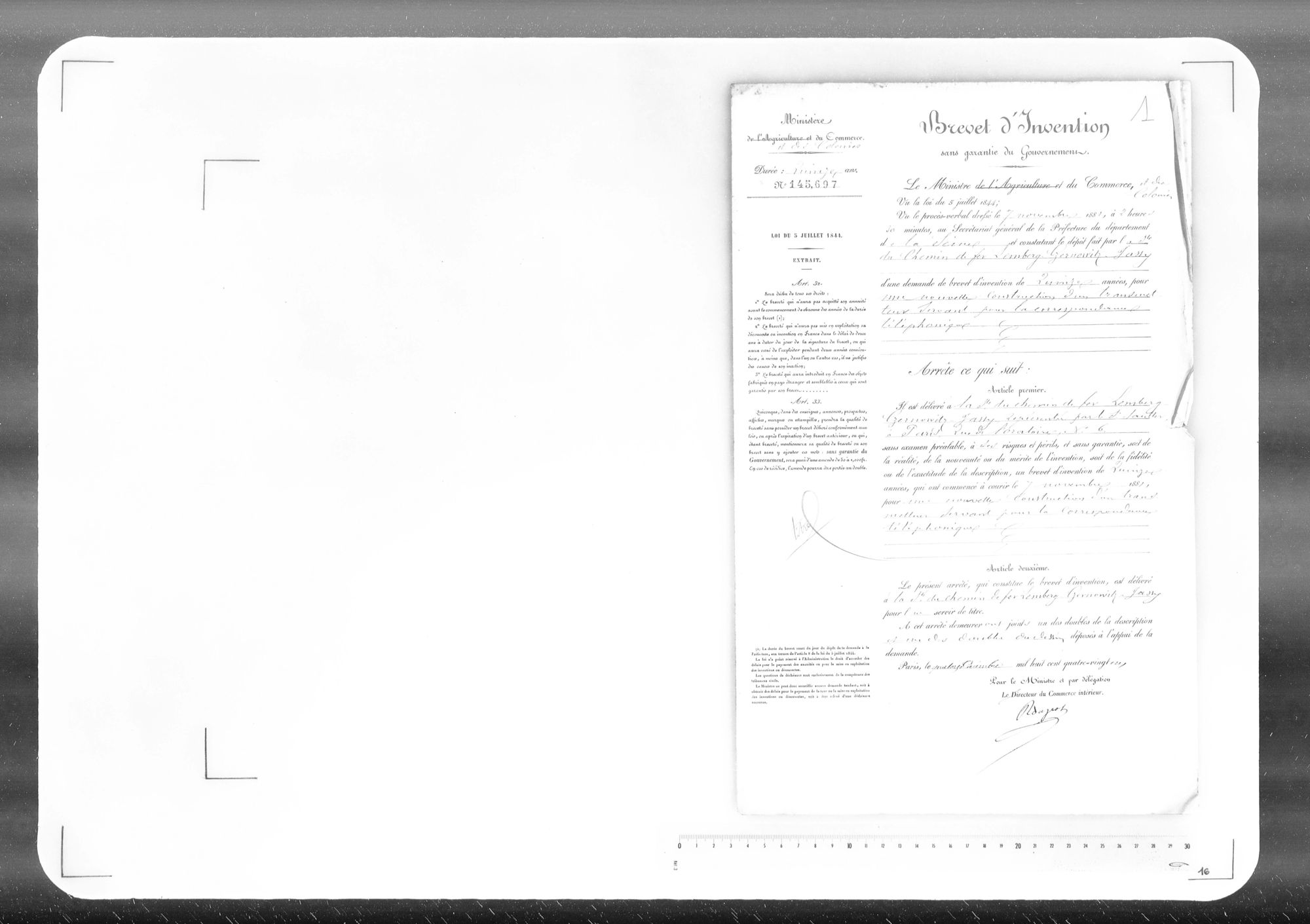 - Brevet d'invention de 15 ans