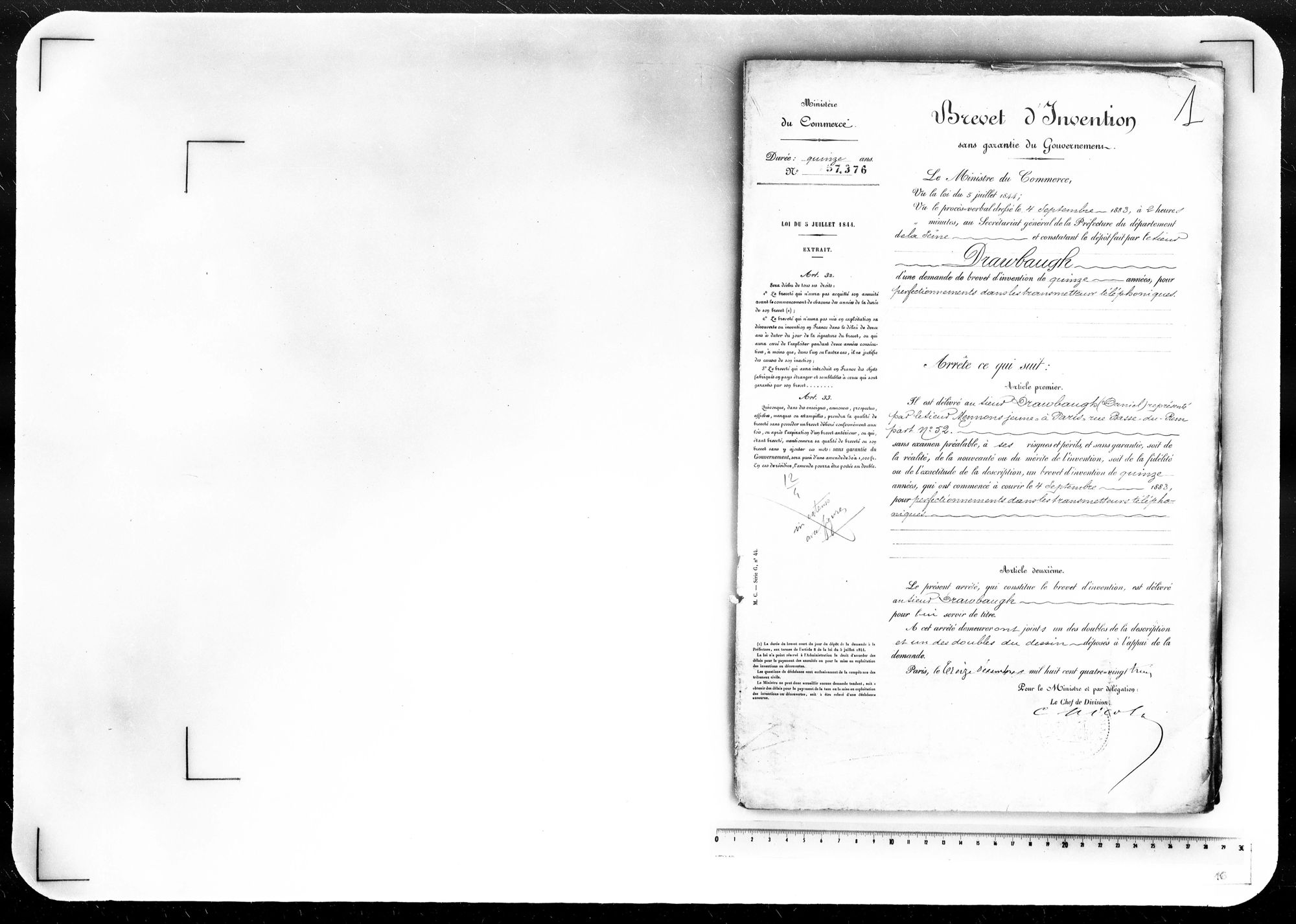 - Brevet d'invention de 15 ans
