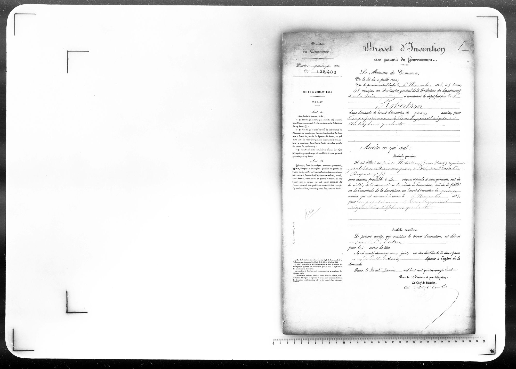 - Brevet d'invention de 15 ans