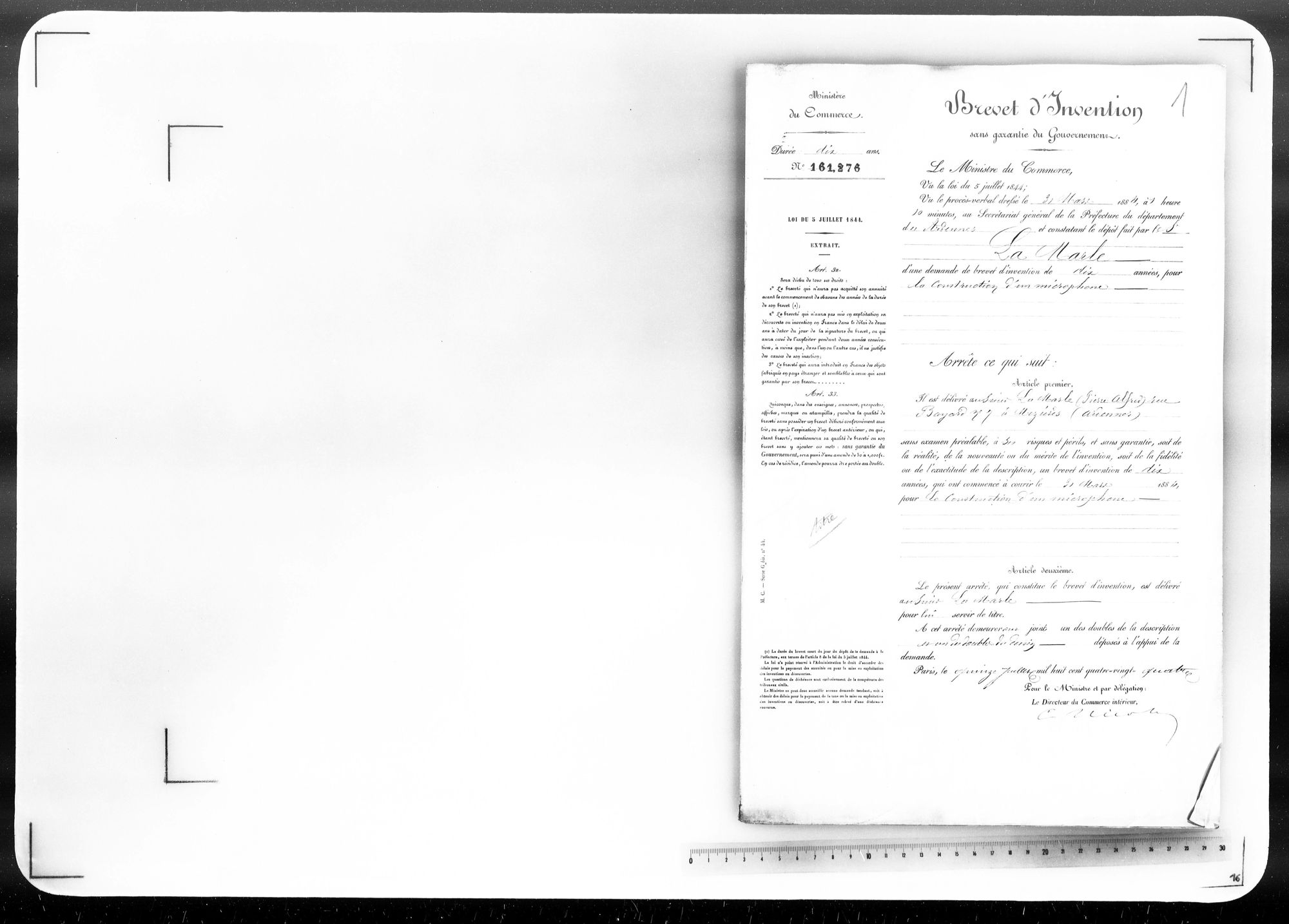 - Brevet d'invention de 10 ans
