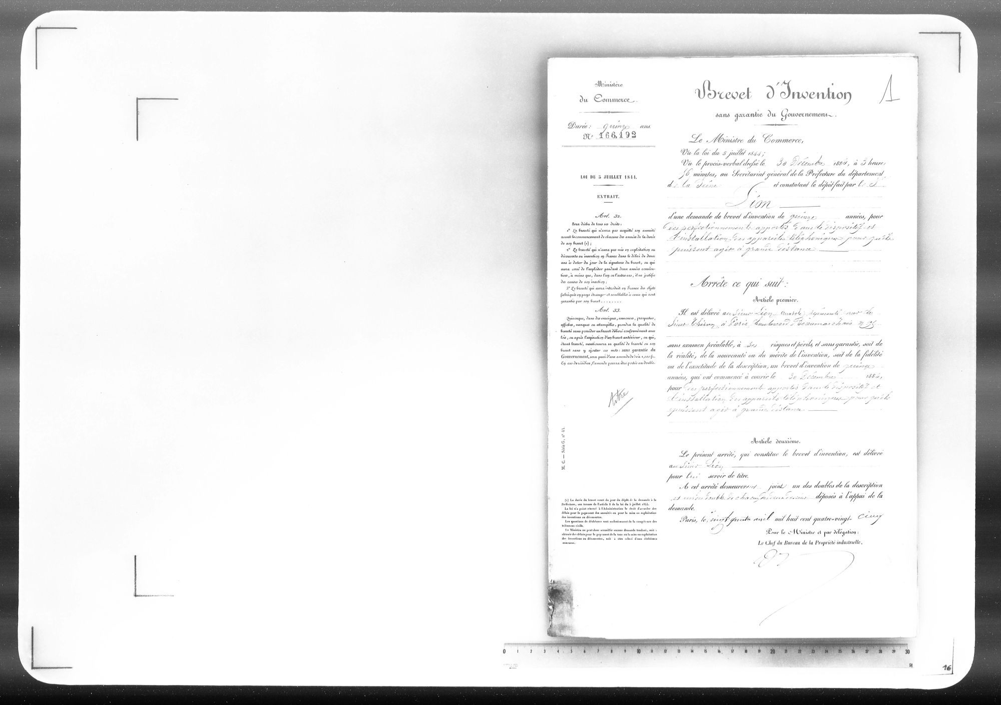 - Brevet d'invention de 15 ans