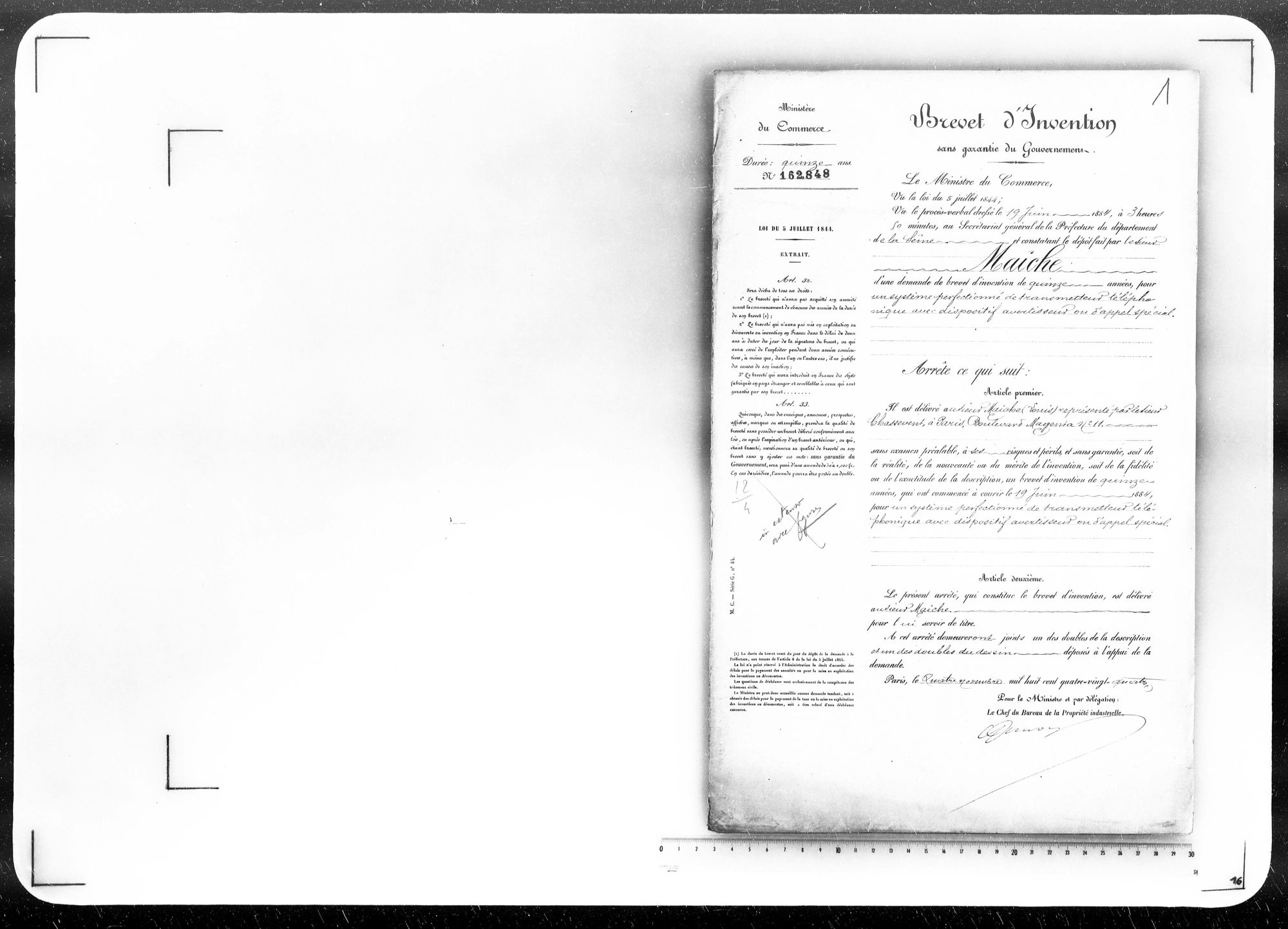 - Brevet d'invention de 15 ans