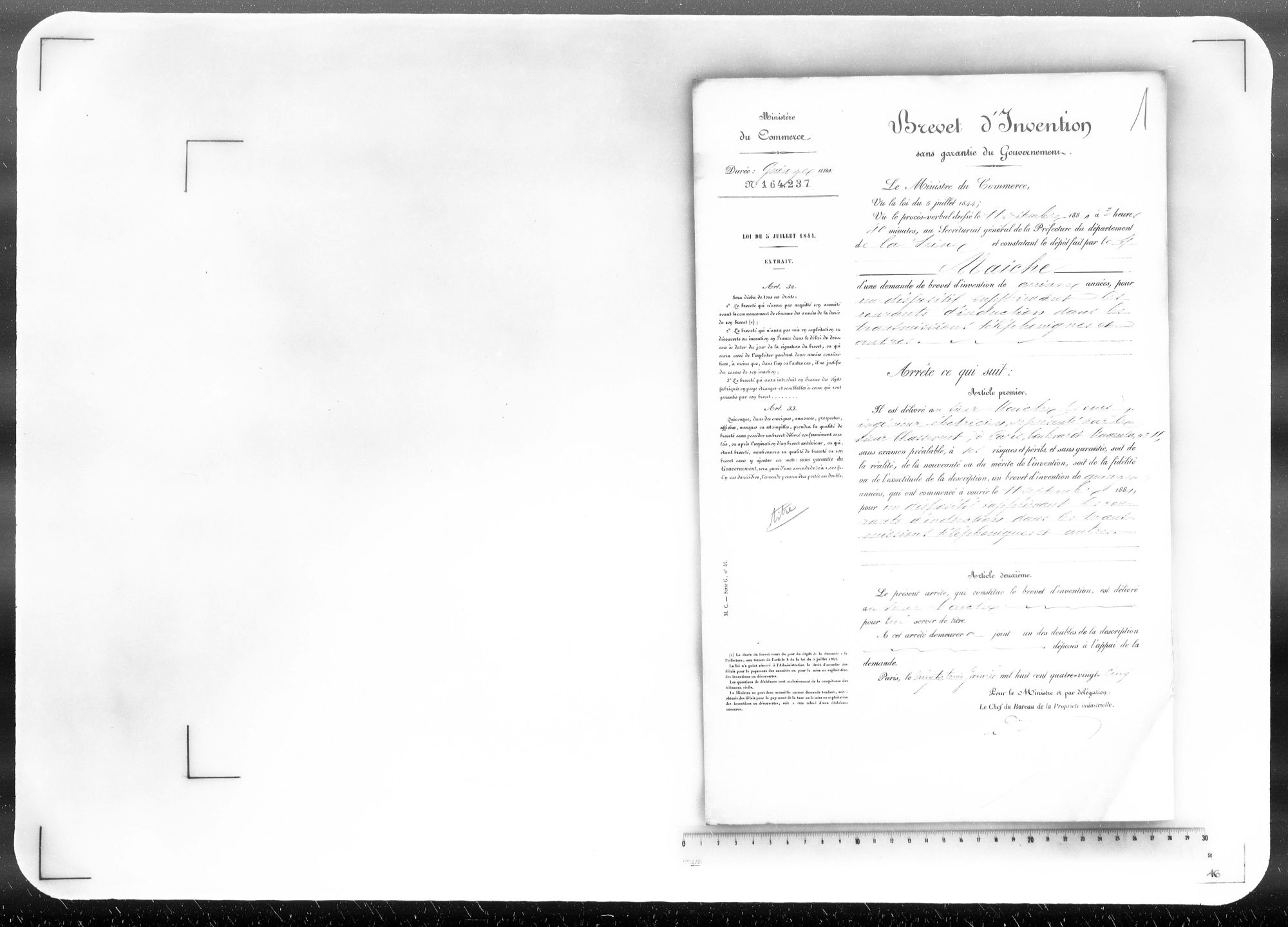 - Brevet d'invention de 15 ans