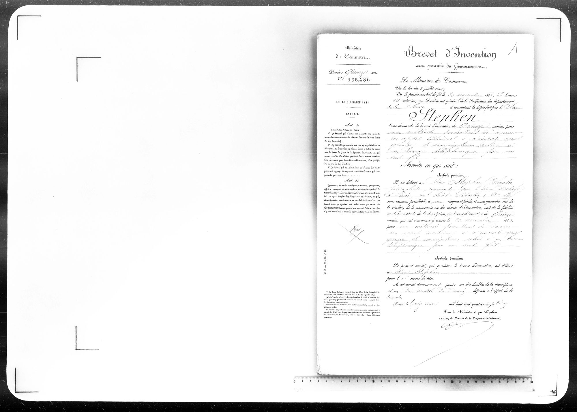- Brevet d'invention de 15 ans