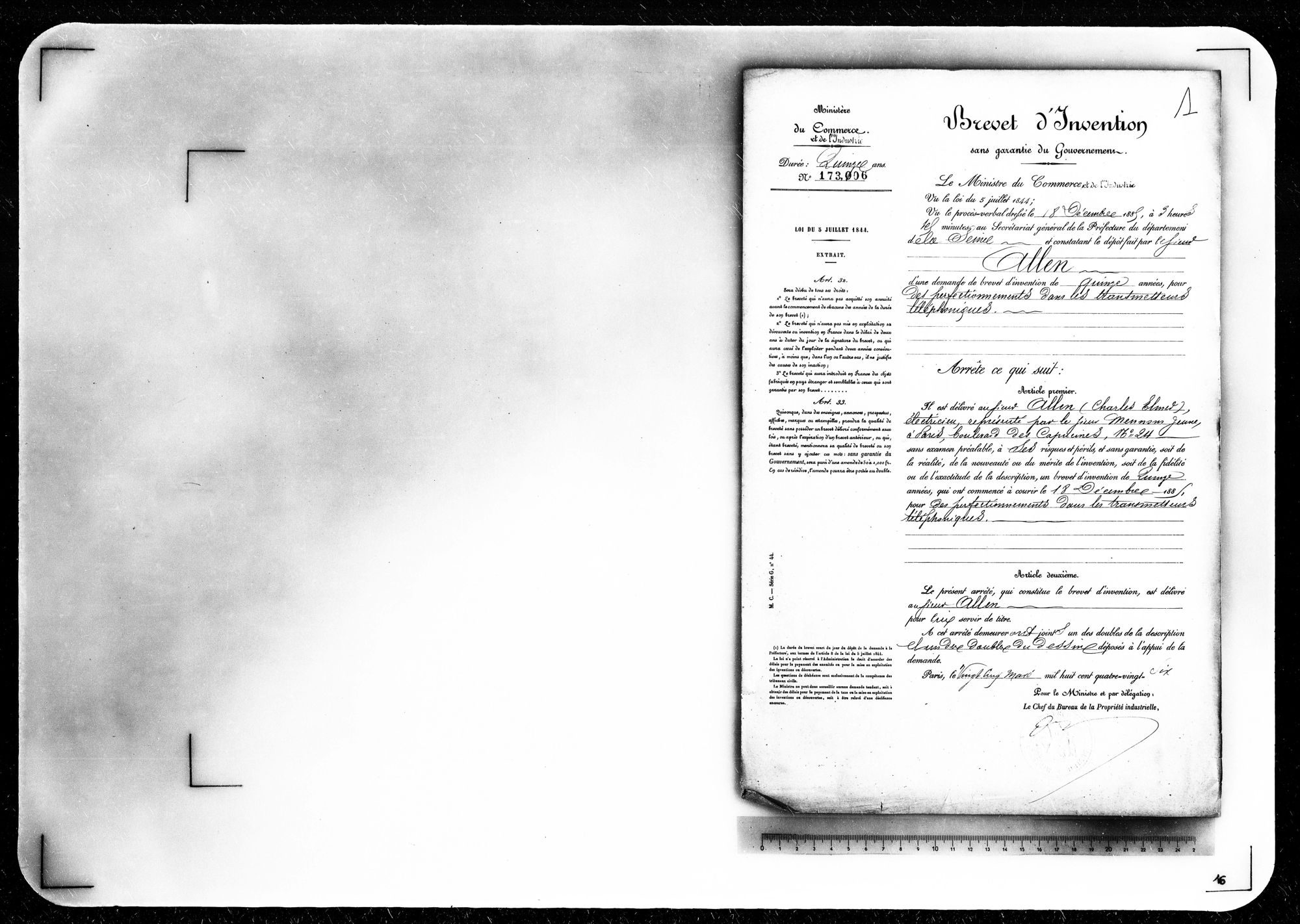 - Brevet d'invention de 15 ans