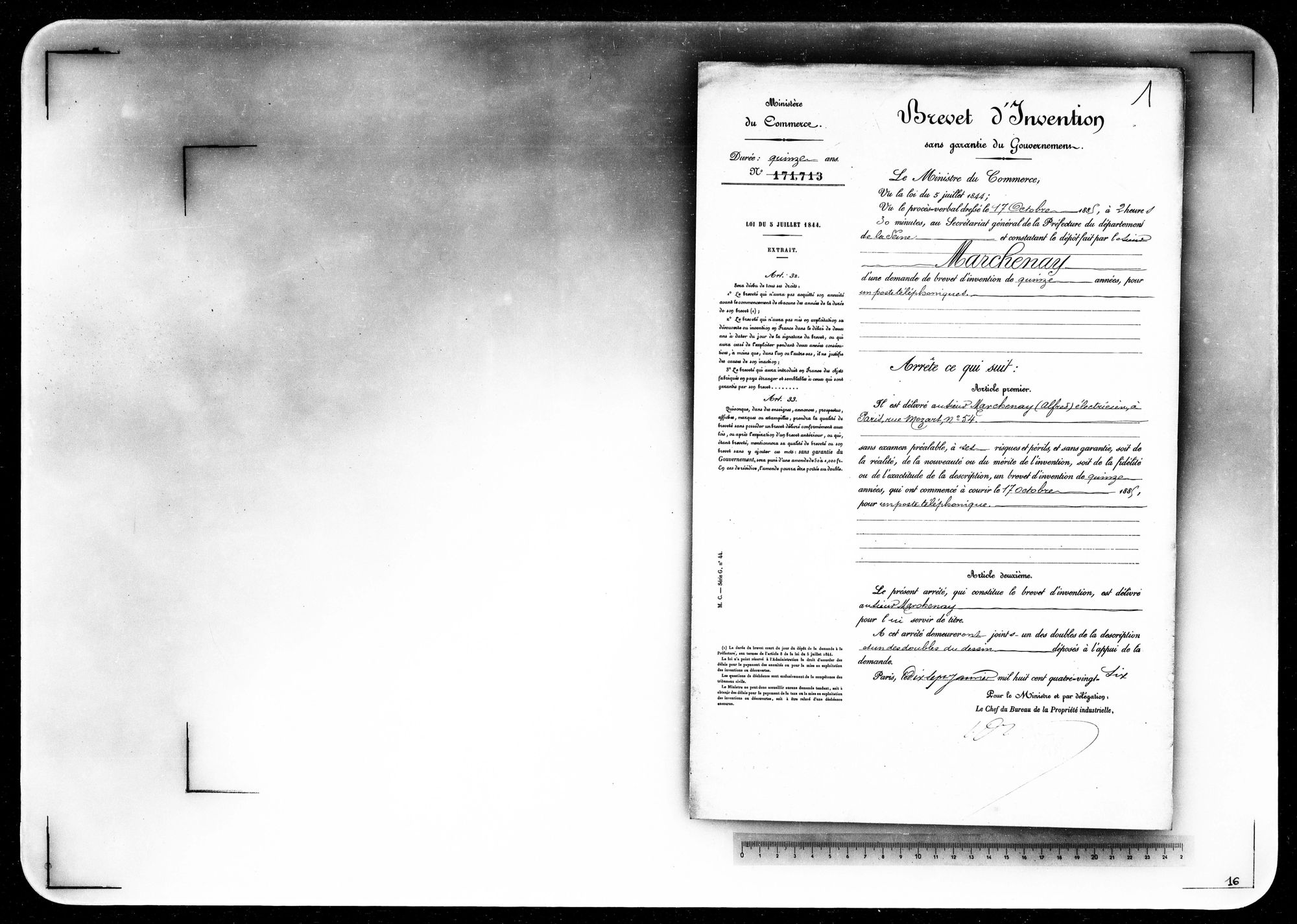 - Brevet d'invention de 15 ans