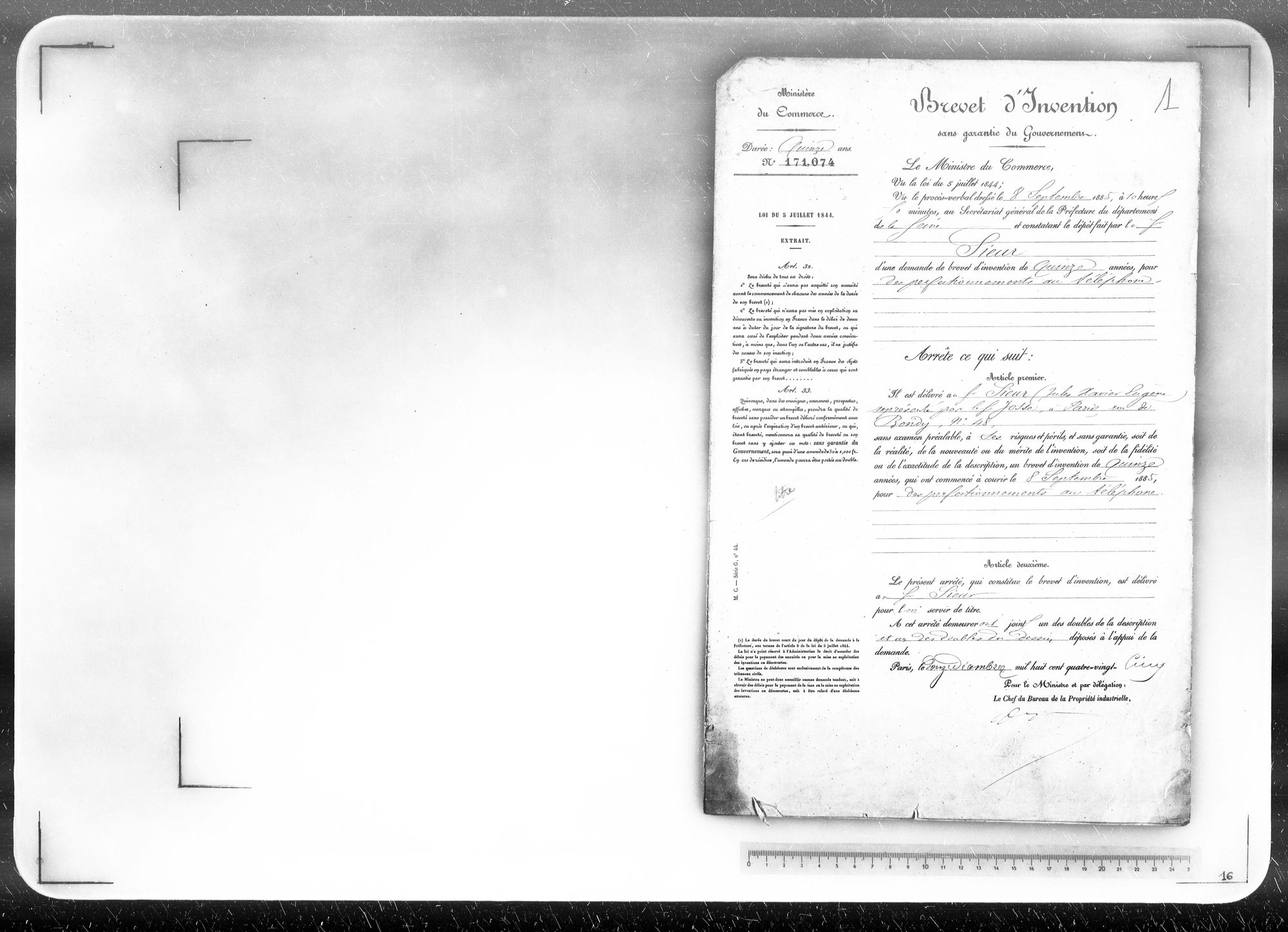 - Brevet d'invention de 15 ans