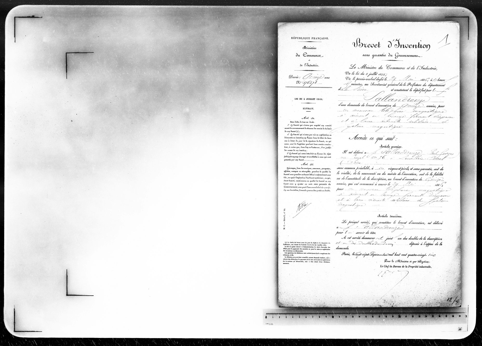 - Brevet d'invention de 15 ans