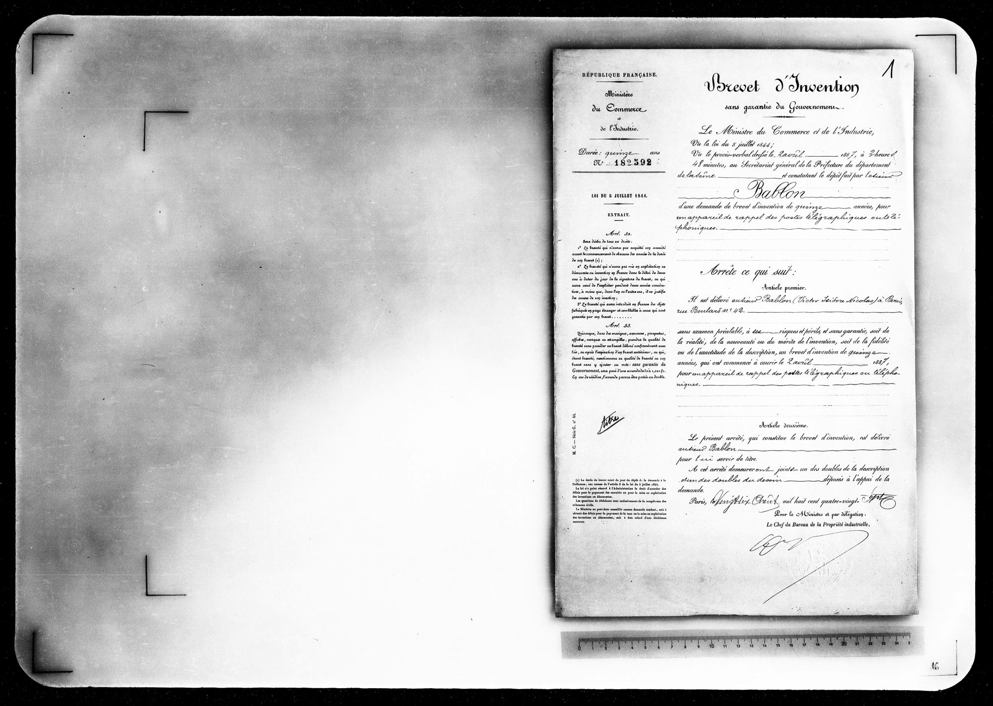 - Brevet d'invention de 15 ans