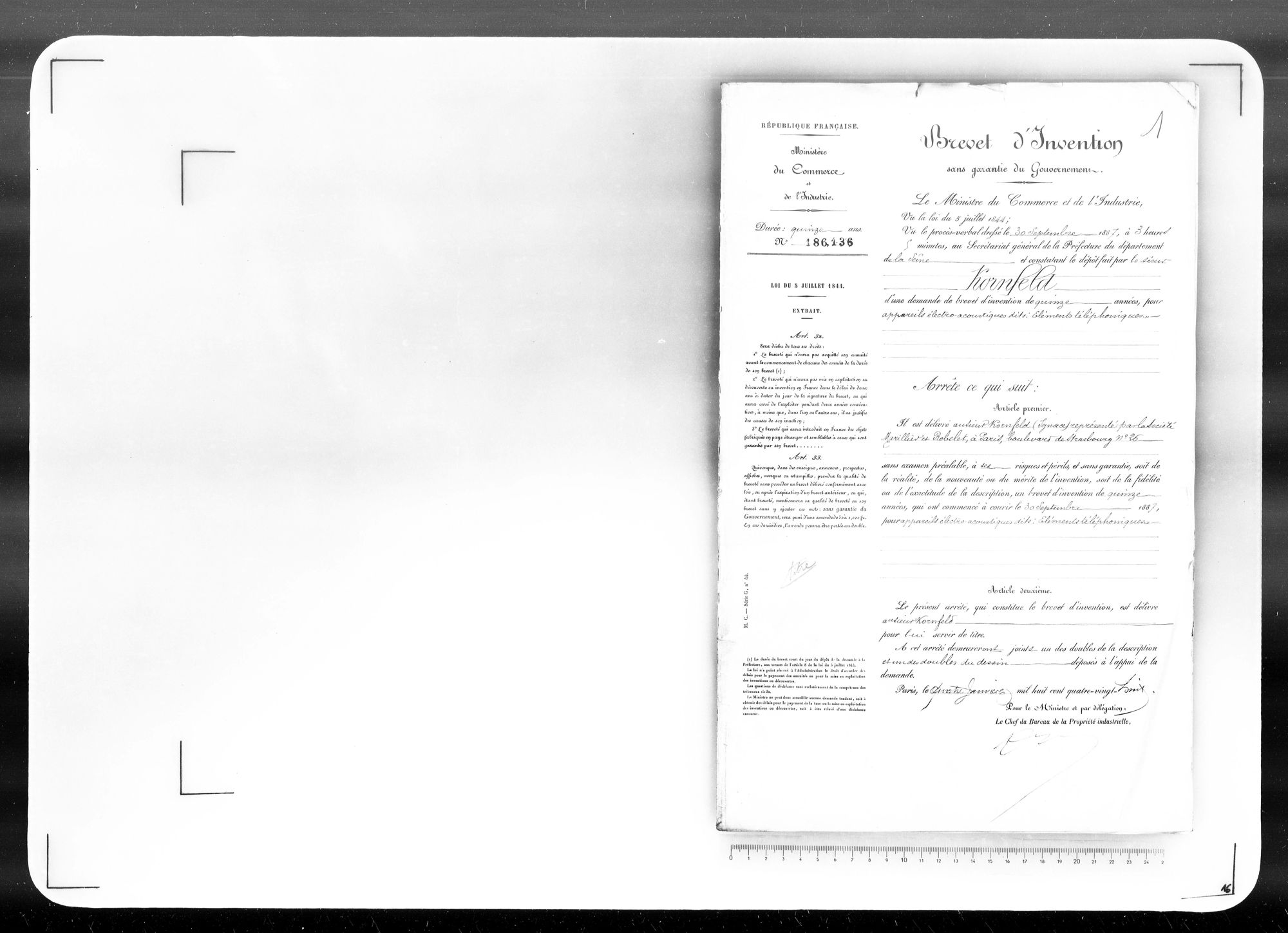 - Brevet d'invention de 15 ans