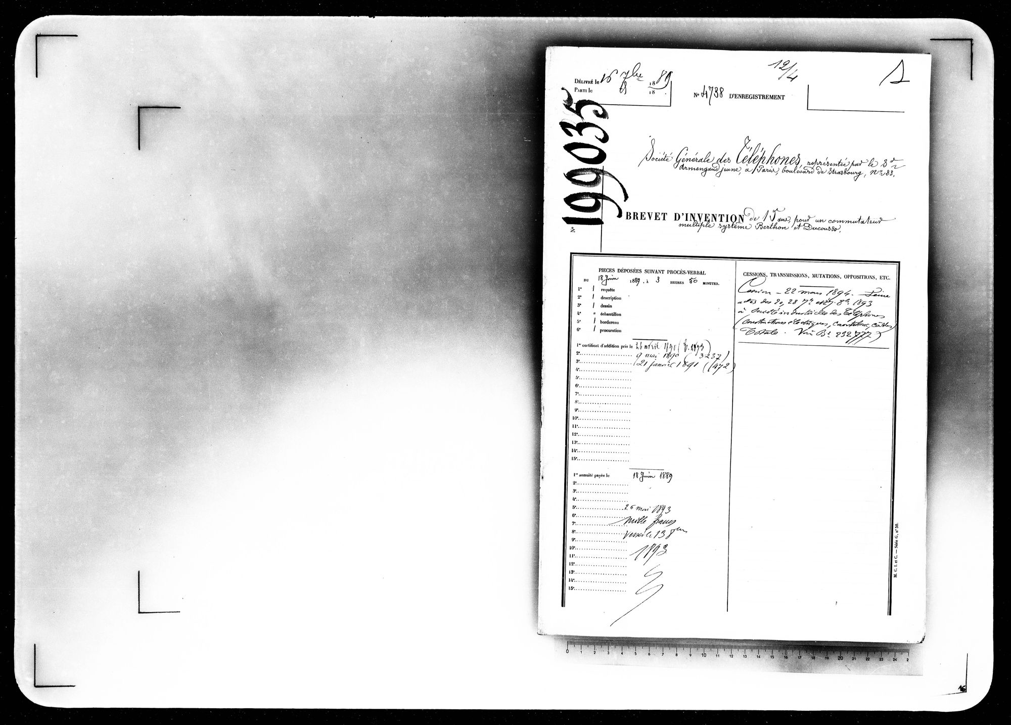 - certificat d'addition au brevet pris le 18 juin 1889, pour un commutateur multiple, système Berthon et Ducousso