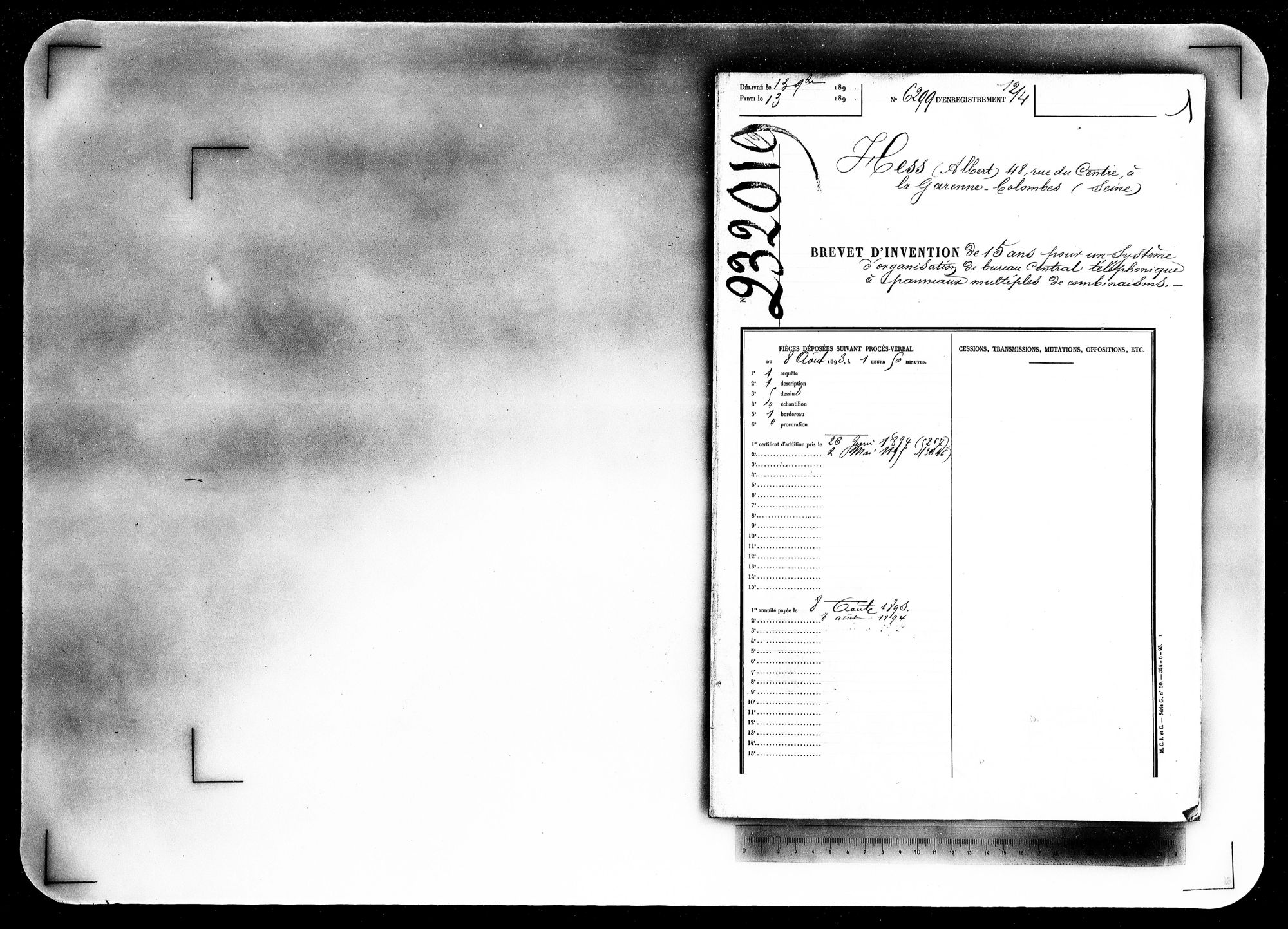 - certificat d'addition au brevet pris le 8 août 1893, pour un système d'organisation de bureau central téléphonique à panneaux multiples de combinaisons